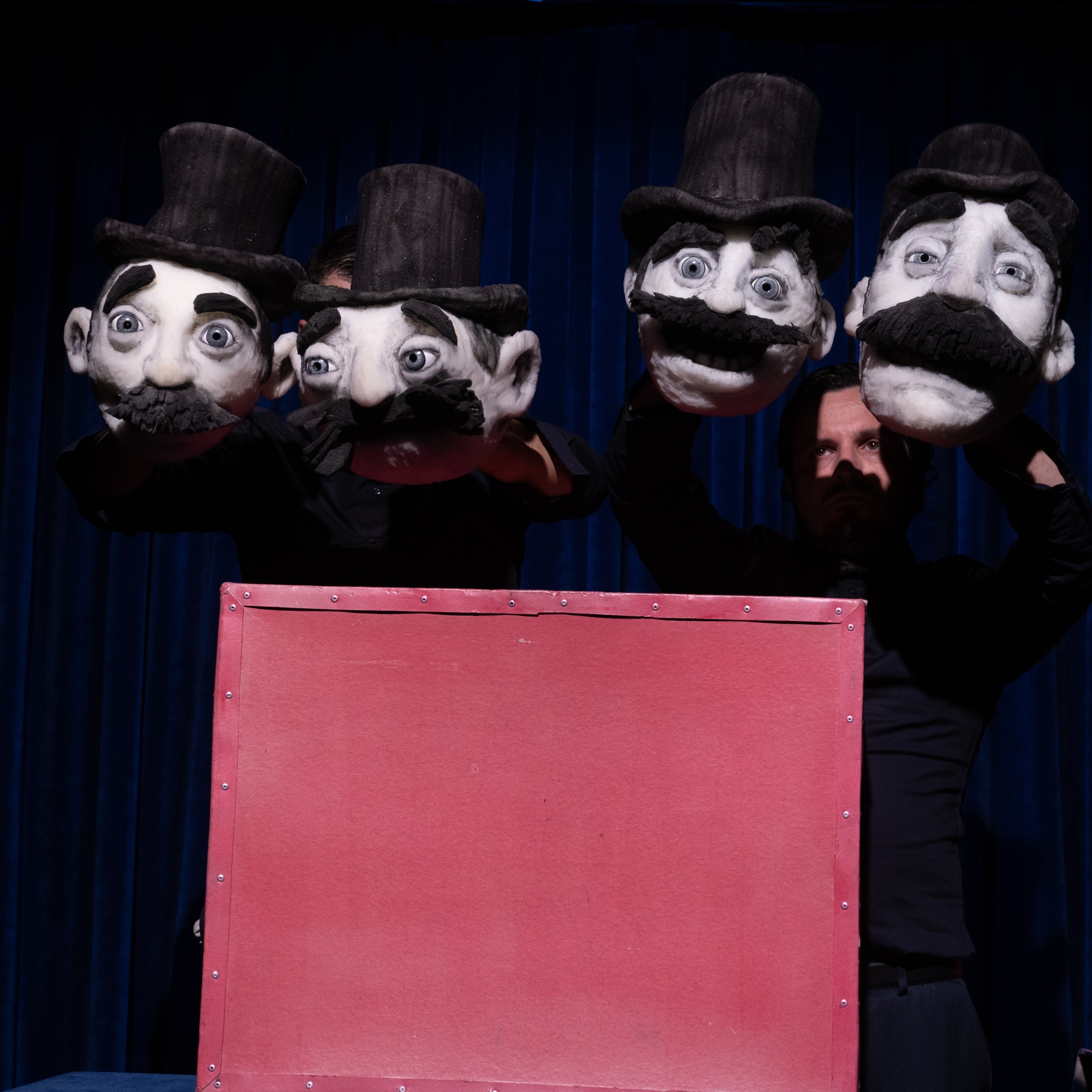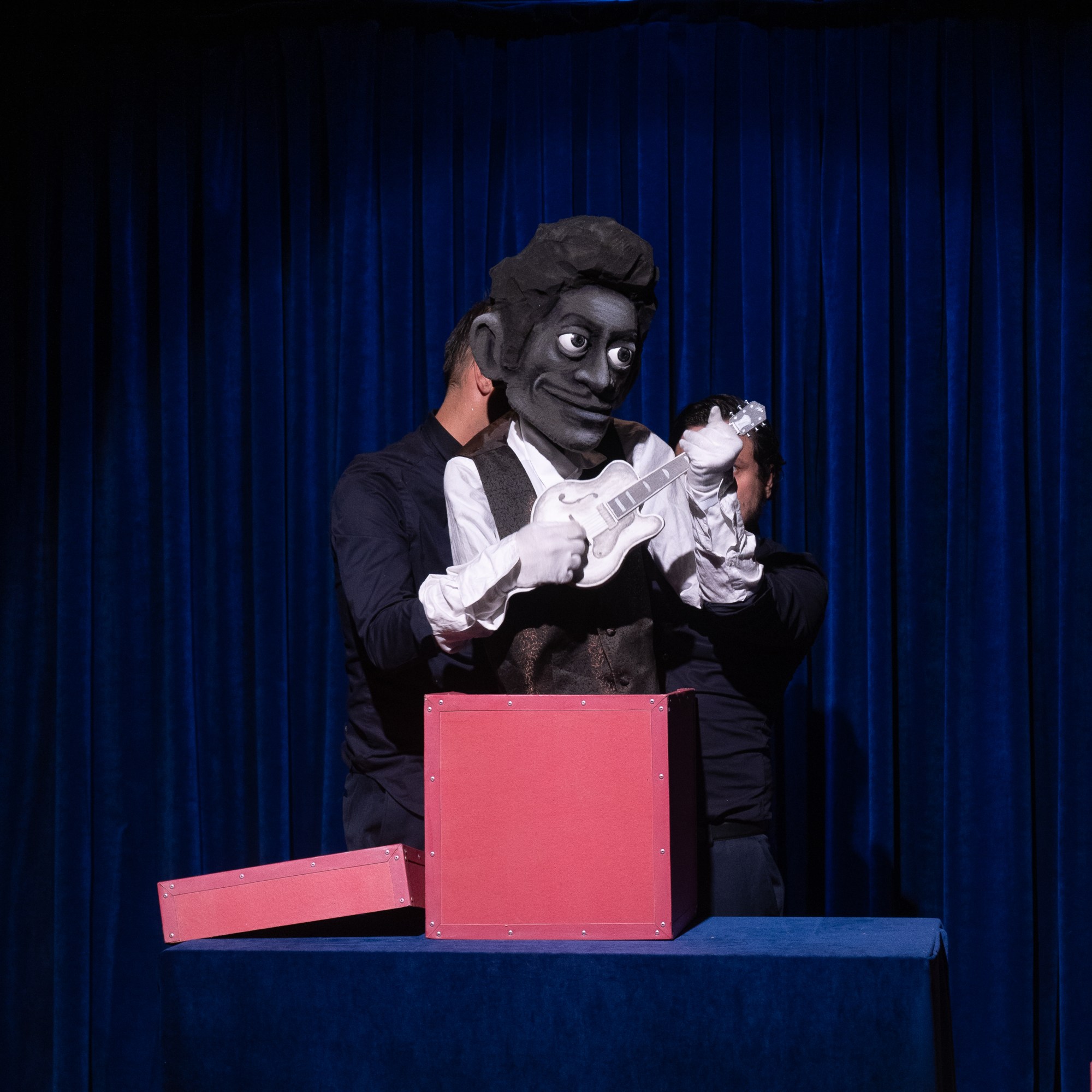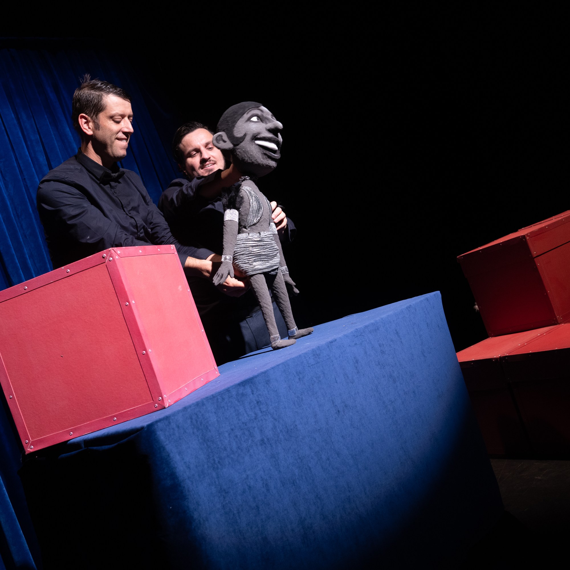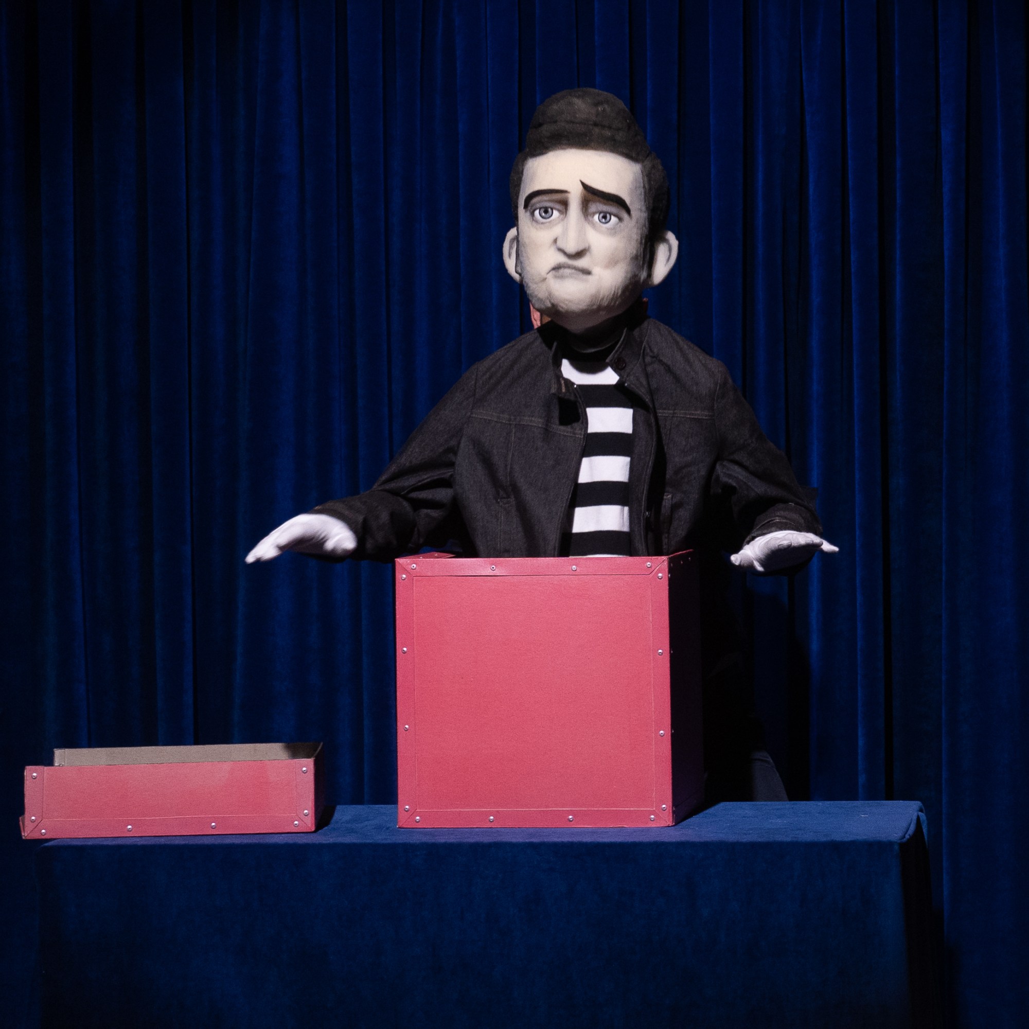 Grâce à 2 Machinistes (les manipulateurs) une vedette en solo, duo, trio ou Quatuor apparaît à chaque fois d’une boite pour venir interpréter une chanson de son répertoire.