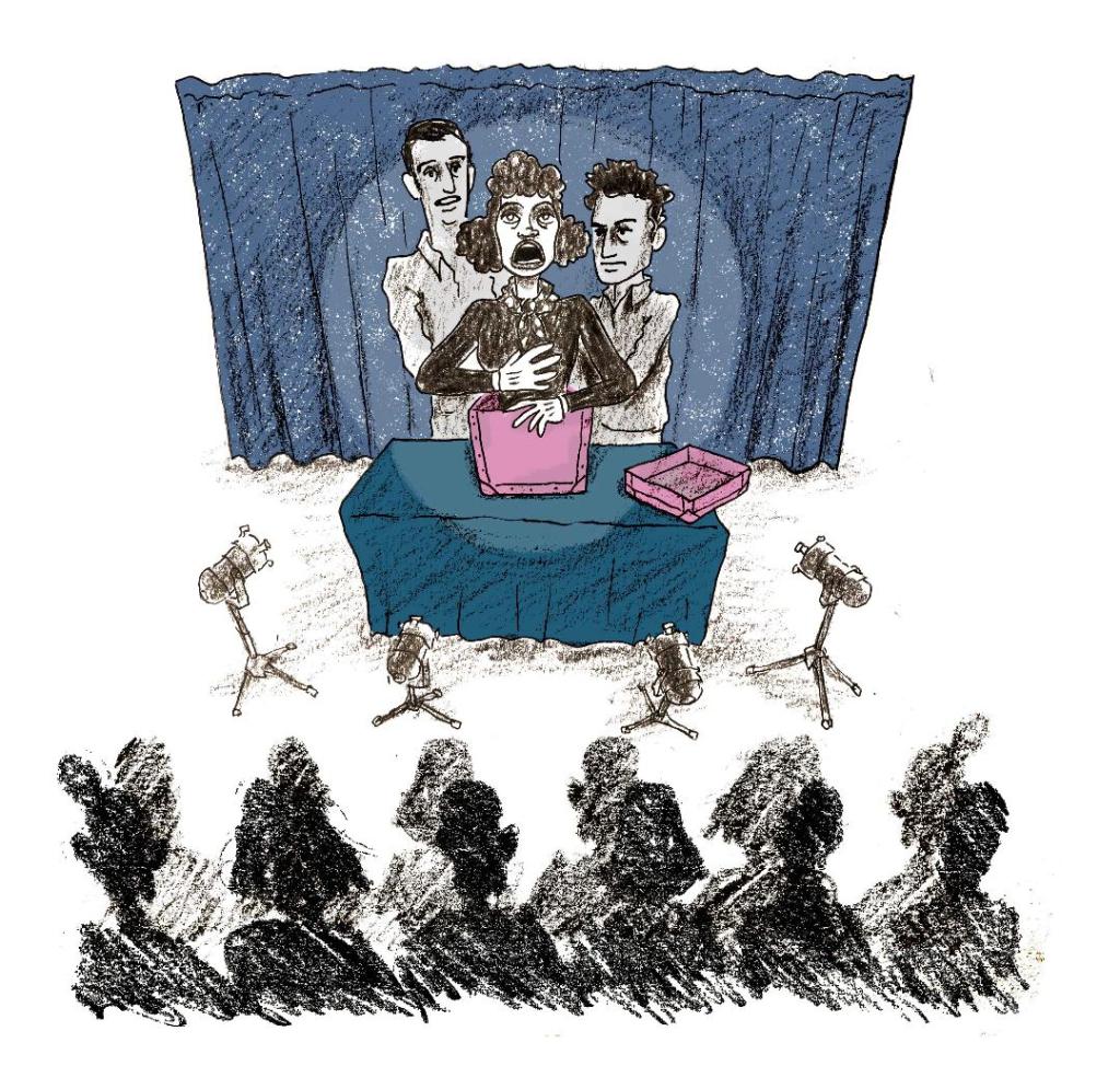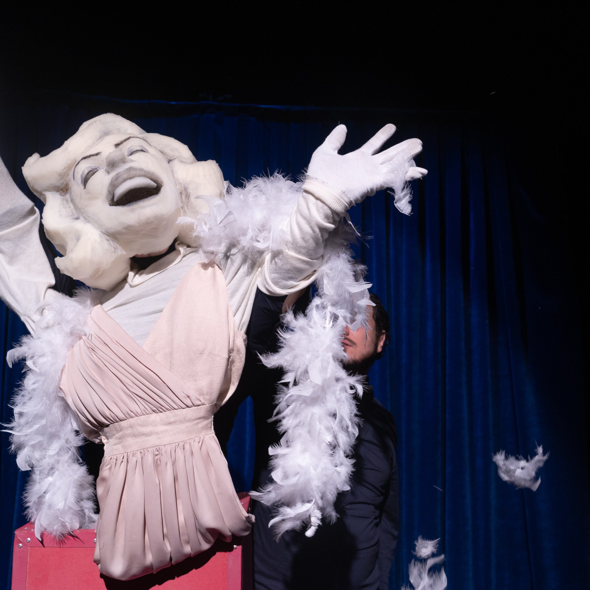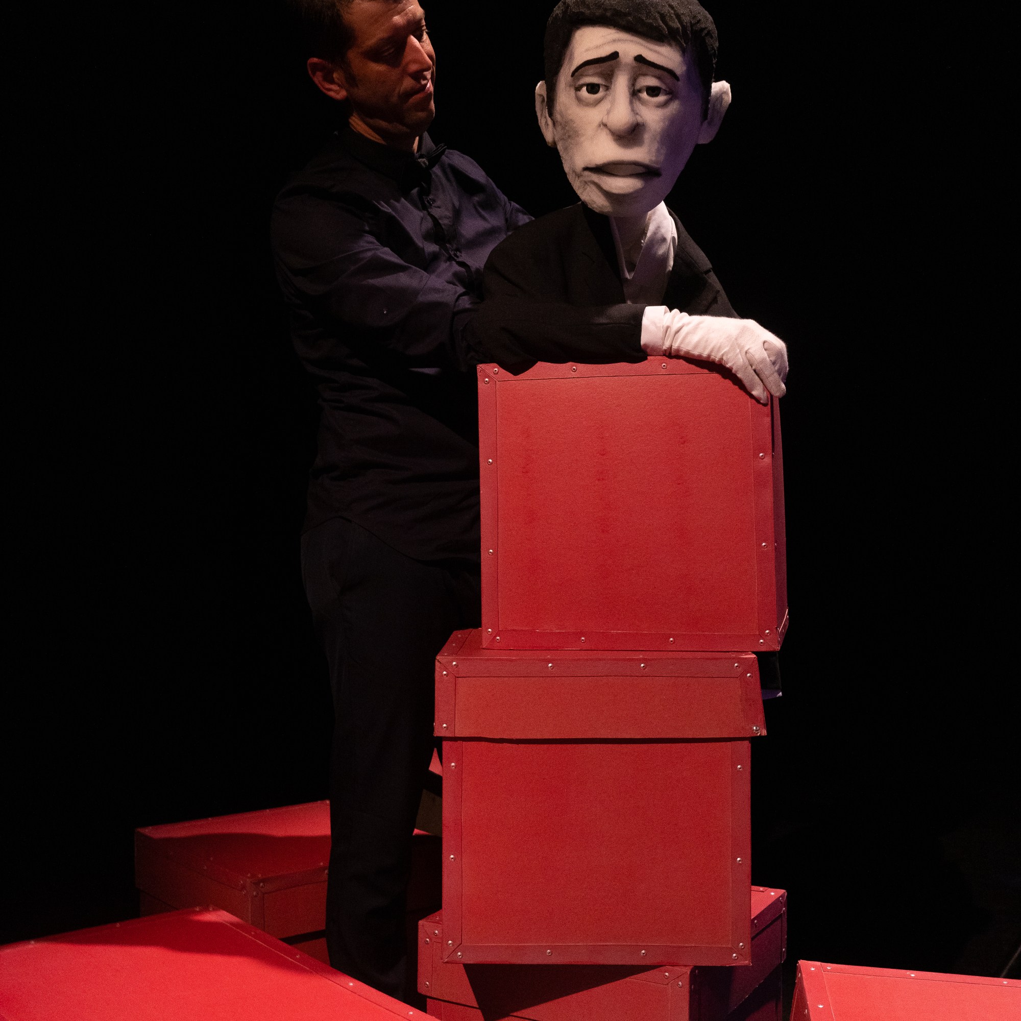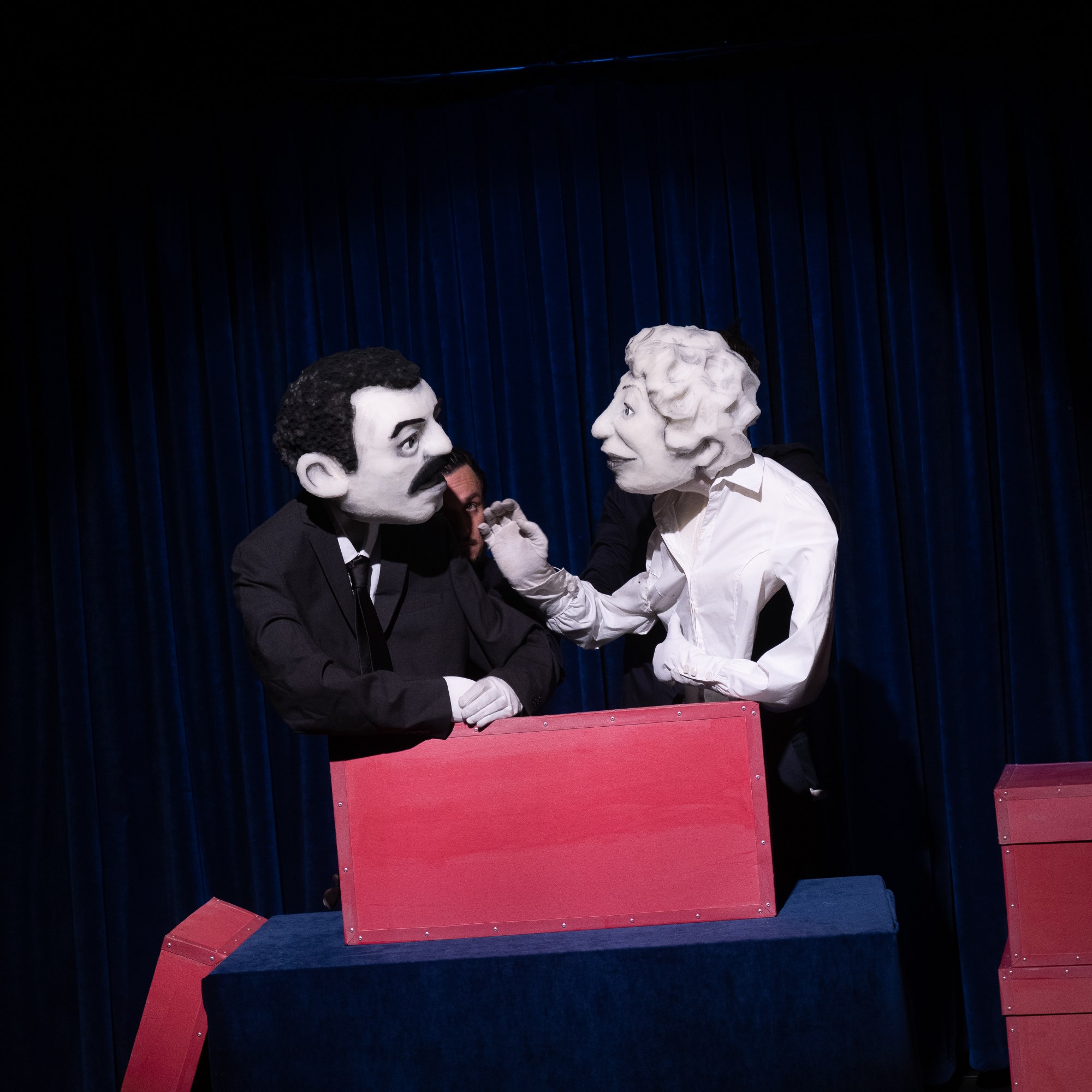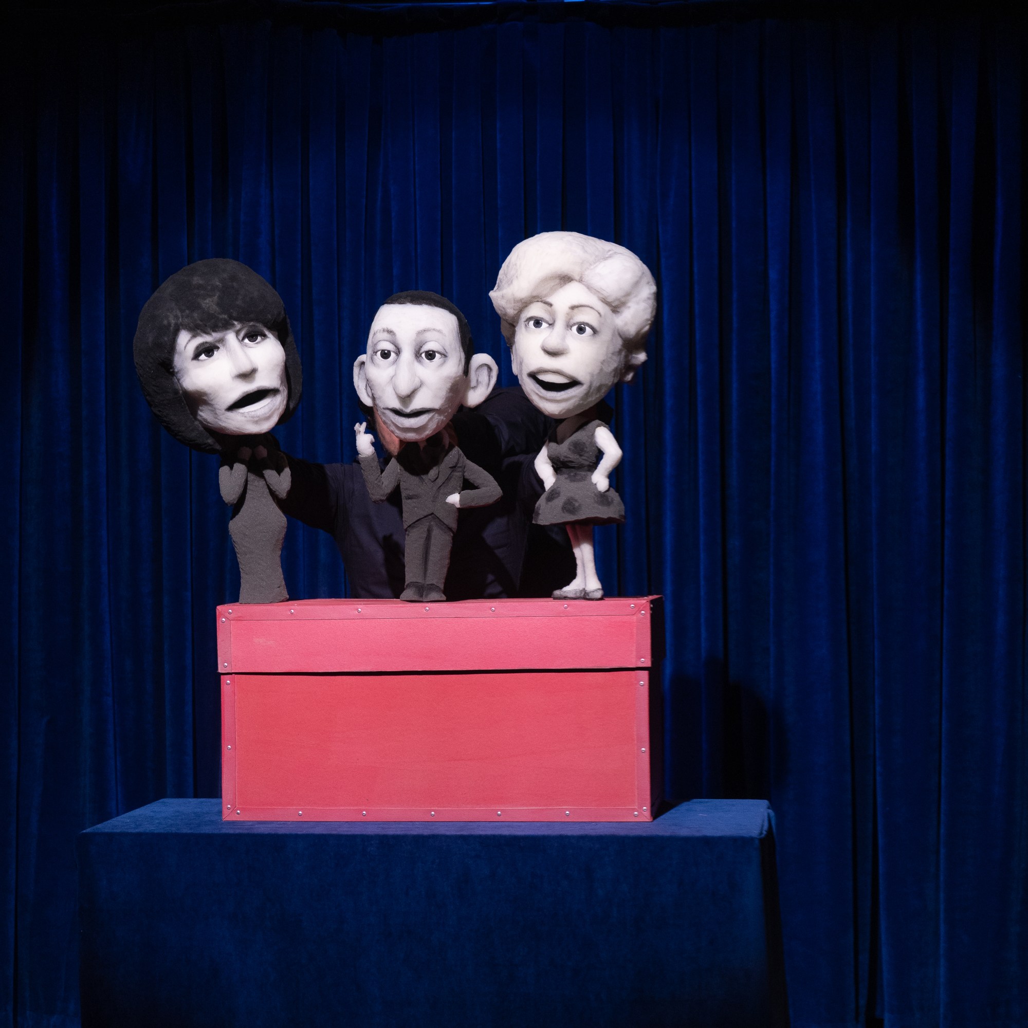 Grâce à 2 Machinistes (les manipulateurs) une vedette en solo, duo, trio ou Quatuor apparaît à chaque fois d’une boite pour venir interpréter une chanson de son répertoire.